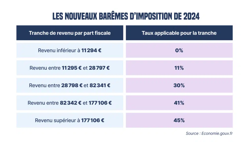 Les nouveaux barèmes d’imposition en 2024 :- Revenu inférieur à 11 294 € : 0 %
